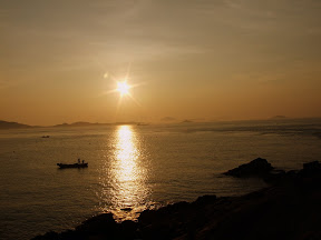 贪婪如我,自然不会错过日出,四点多跳起来,冲到视角最好的礁石上,静静等待。竟然发现海上已经有一闪一闪的灯光——渔夫们比我更早,日复一日的早。当太阳突然跃出海平面的时候,能看到的渔船已经缩成了一个个金色小点,各自远扬。